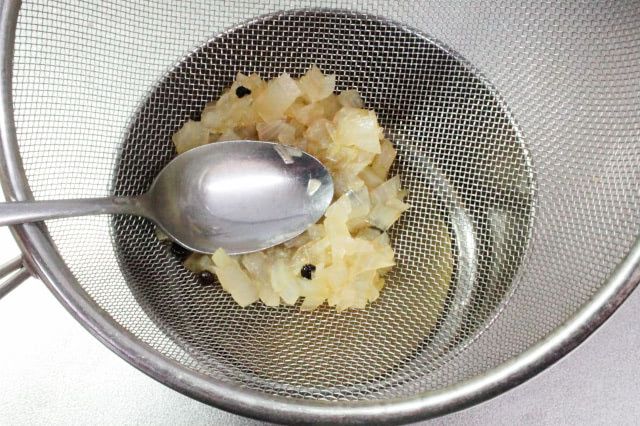 3. 玉ねぎをザルにあげ、スプーンの背で押さえて、しっかりと濾します。