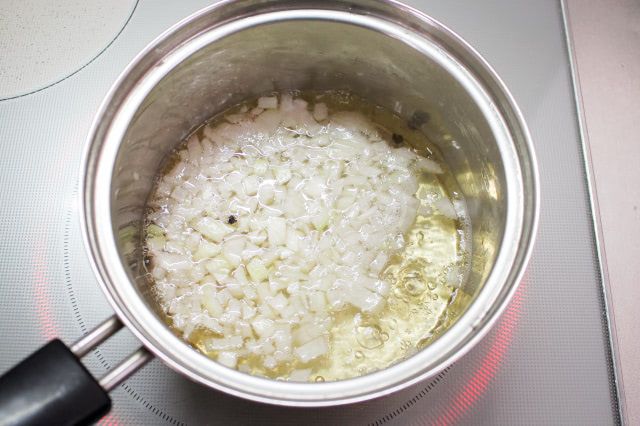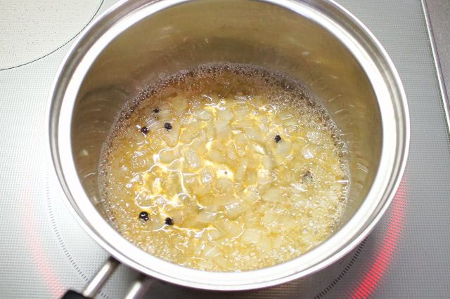 2. 鍋に玉ねぎ、塩、粒こしょう、白ワイン、りんご酢を入れ、中火で、水分がほとんどなくなるまで煮詰めます。