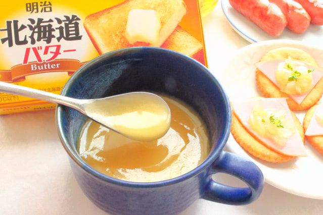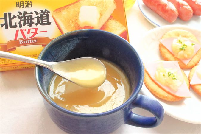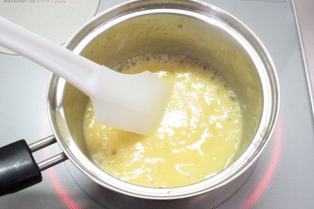 乳白色のとろ~っとしたソースで、色味を少し淡くしたコーンポタージュスープや、濃度をゆるくしたマヨネーズにそっくりな質感です。少し味見してみると、バターをたっぷり使ったわりには、すっきりとキレのいい味。