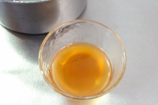 濾したソースを計量すると、約30mlでした。煮詰める前、白ワイン100mlとりんご酢を50mlを加えたことを考えると、かなり煮詰まっていますね。蜂蜜のような淡い黄金色になりました。