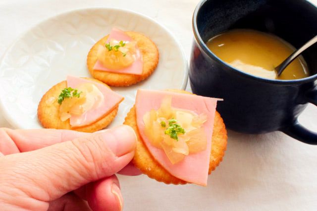 最後は、ソースを濾した時に残った玉ねぎを活用し、カナッペにしてみました。クラッカー、ハム、「ブールブランソース」、ソースに使った玉ねぎ、パセリを組み合わせると、とってもおしゃれなおつまみに。