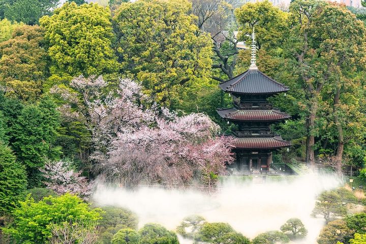 そんな桜が美しく咲き誇るシーズンに開催されるのが、人気の庭園演出「東京雲海」と、ライトアップされた桜の饗宴による「夜桜雲海」です。雲海と光によってピンク色に揺らめく夜の日本庭園の風景は、うっとりするほど幻想的。