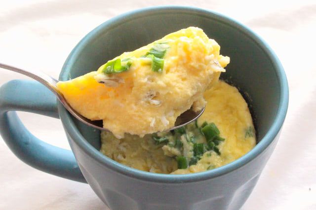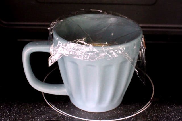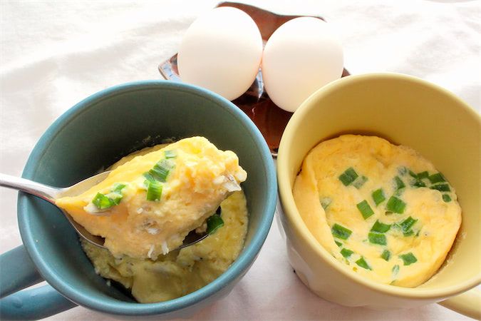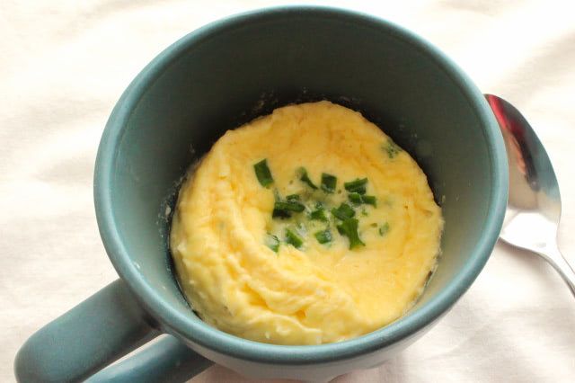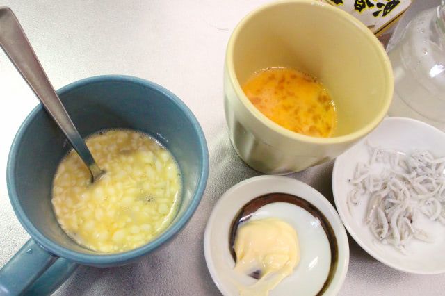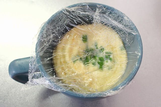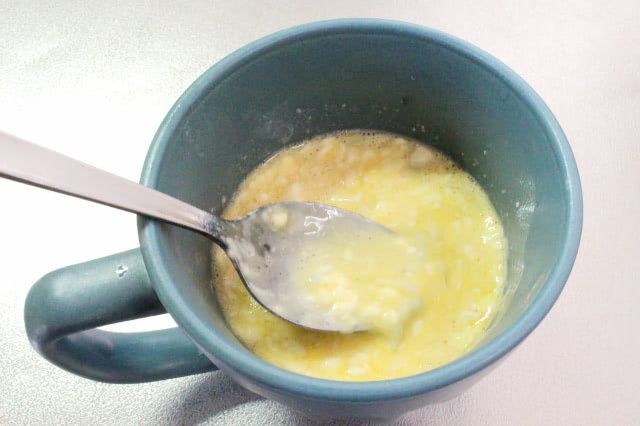 今回は耐熱性のマグカップに卵液を注ぎました。卵は加熱ムラが出やすいので1個ずつ、電子レンジで加熱してくださいね。