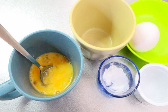 1. 器1個につき、片栗粉(小さじ1)と水(小さじ1)を入れてよく混ぜ、卵(1個)を加えてよく混ぜ合わせます。