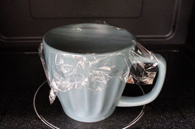 電子レンジで加熱して作るので、耐熱性の器(直径が8.5cm、深さは7cmくらい)を2個ご用意くださいね。