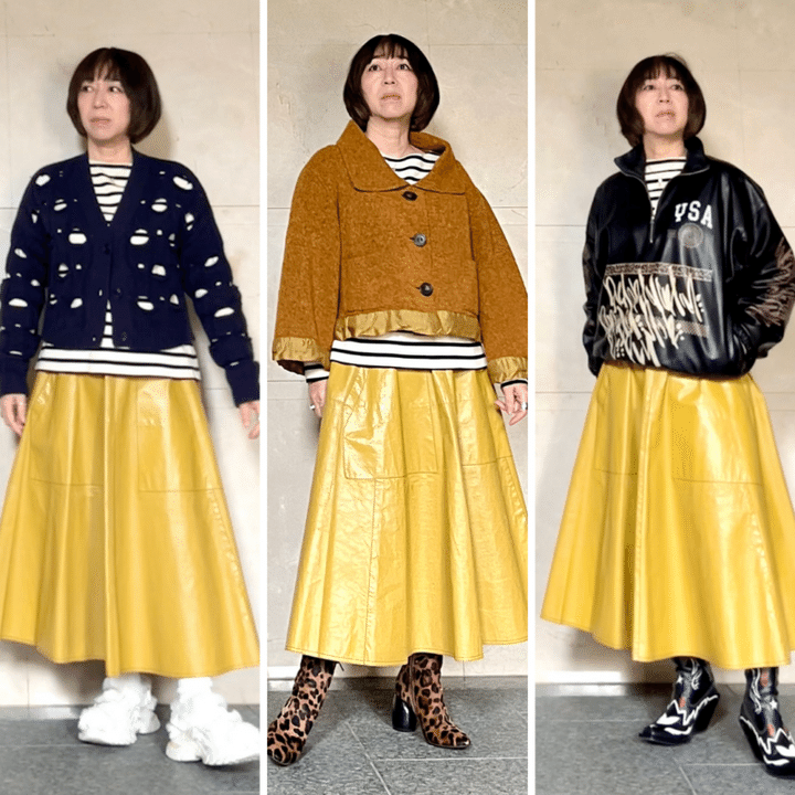 今年に入ってあっという間に3月になってしまいました。今月は古着スカートの着回しコーディネートをご紹介したいと思います。 皆さんは古着は着られますか? 私は出会いとタイミングと相性が合うと購入します。誰かが大切にしていたものであったり、泣く泣く手放したものかもしれませんから、長く大切に愛用できるのかをしっかり考えてから購入しています。 今回は6年前に古着のフリマで購入した、ボッテガ・ヴェネタのラムレザーフレアースカートを使った着まわしコーディネートを考えてみました。 フレアースカートはフェミニンなスタイルが得意なアイテムだと思いますが、私はモード感のあるカジュアルスタイルにするのが好みです。 今回は古着のスカートとボーダーTシャツ、シンプルなネックレスを共通アイテムにして、アウターと靴は個性的なものを選んでコーディネートしてみました。