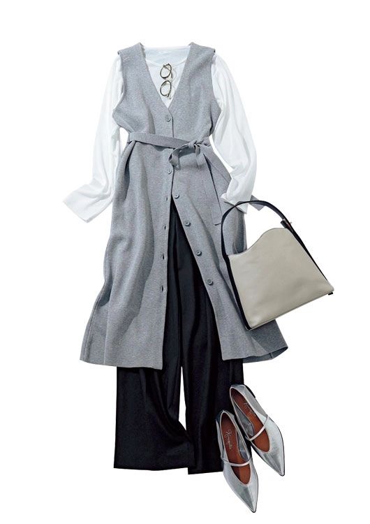 黒パンツは縦長シルエットをつくるジレとは最強コンビ。