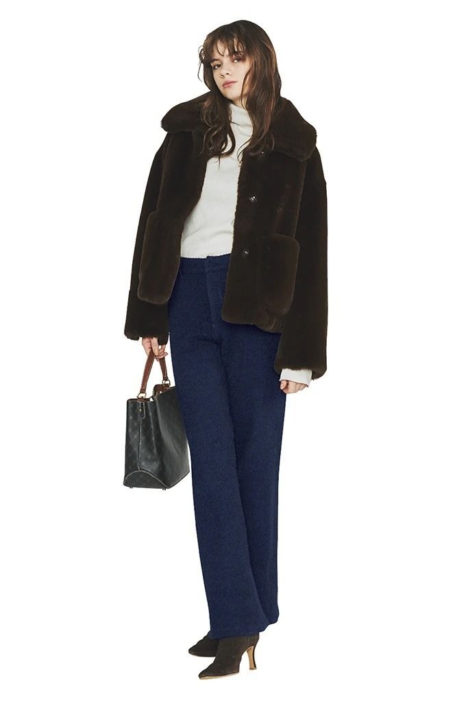毛足の長いシャギー糸と太番手の糸とを編み込んだのち、型押しを施してデニムのような見た目に仕立てたニットパンツ。デニム特有のかたさが苦手な人も手にとれる、肌あたりがよくゴワつかない風合い。伸縮性のあるウエストの仕立てで窮屈感もなし。ゆるやかにすそが広がるベルボトムデザインはヒールとも相性がよく、ヒザ位置も高く見えて、脚長効果も抜群。 ネイビーデニムライクニットパンツ/AMERI(Ameri VINTAGE)