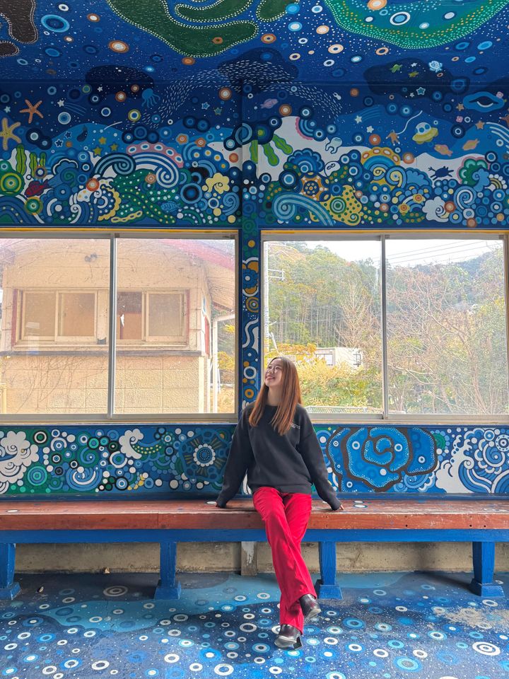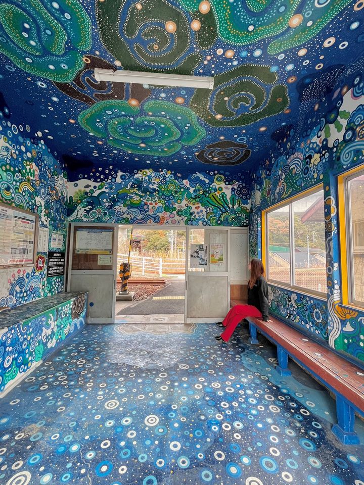 電車は1日にたった数本で利用する人も少ない小さな駅ですが、中に入るともったいないくらい美しいアートが壁一面に広がっています。
