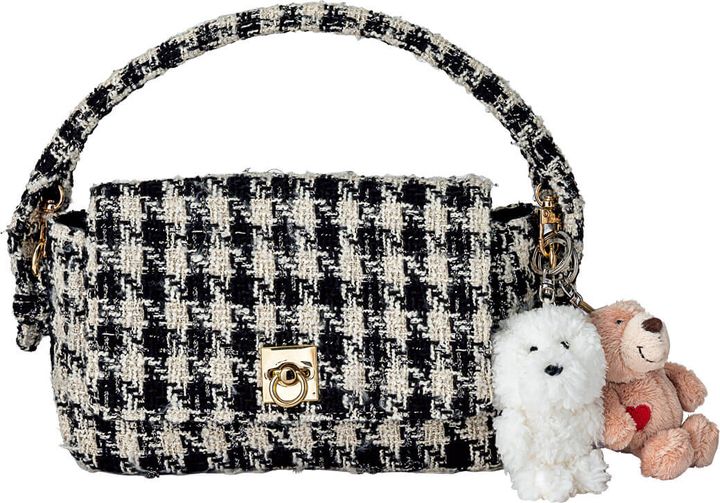 ツイードバッグ[15×23×7㎝]¥6,490/カシュカシュ(アンビリオン) 犬チャーム¥1,430、くまチャーム¥1,012/ともにPLAZA(PLAZA カスタマーサービス)