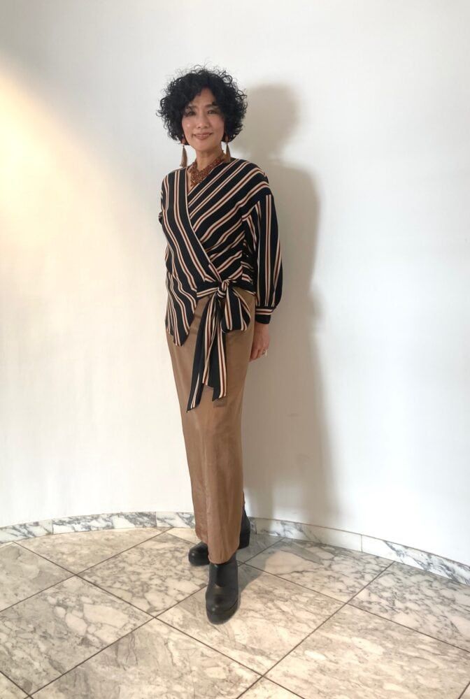 「パーティなので、ボリュームのある華やかなピアスとネックレスをセレクト。アクセサリーの雰囲気がエスニックっぽいので、それに寄せてコーデを決めました。トップスは『ZARA』で、裾を前でも後ろでも結ぶことができるもの。今回は前に結んでエレガントな雰囲気に」。光沢感のあるスカートを合わせ、スタイリッシュな着こなしに!