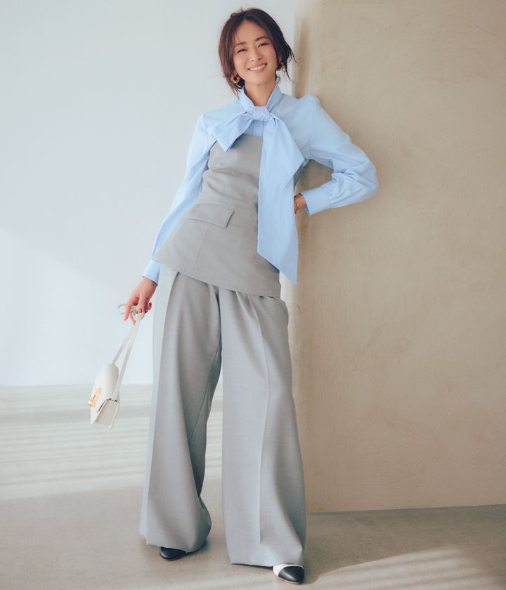 コートを脱いでいよいよ春ファッションも本番! と思いきやワンツーではなんだか心もとない大人のコーデ悩みが発生。この春は甘ブラウスに合わせるだけで鮮度も上がり単品でも重宝間違いなしのビスチェセットアップを。キレイ色とも相性抜群のグレーで知的に。
