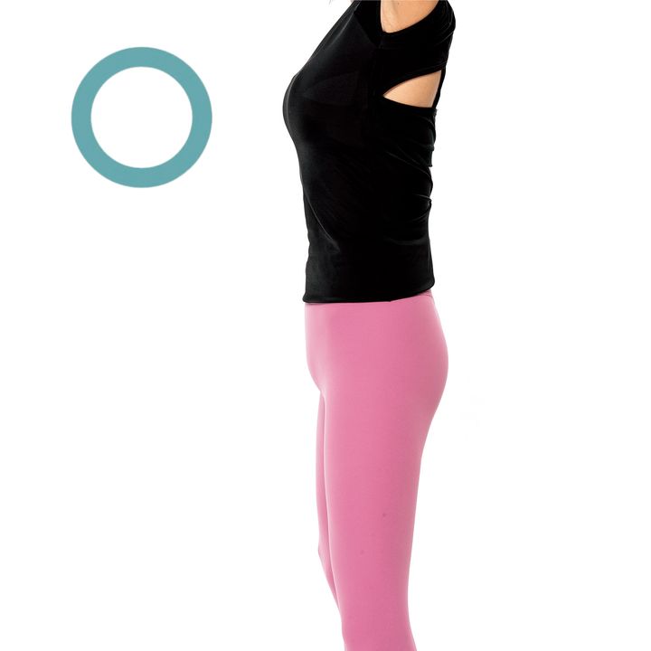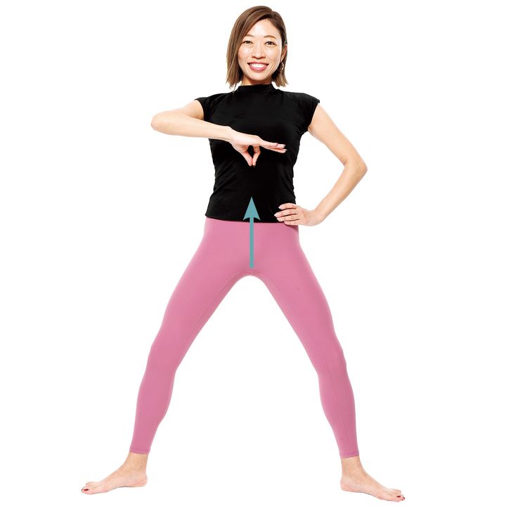 まずはこの姿勢で膣を締めたり緩めたりする感覚をマスターして。脚を肩幅より広めに開き、股関節を緩めて両足の力を抜いて手は腰に。頭、乳首、肛門の方向も意識を。