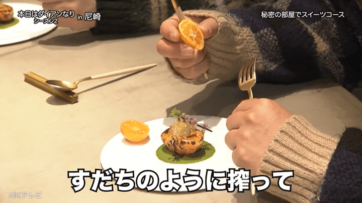 スイーツコースは、全3品で3500円。使用するフルーツは季節によって異なり、ダイアンが訪れた日は、柑橘類がメインだった。1品目は、津之輝、土佐文旦、金柑といった柑橘類に、甘酒と米麴などで作ったアイスクリームを乗せ、その上に青山椒をかけたもの。試食したダイアンは、「うわ~キレ~!」「見た目もスゴイ!」「めっちゃおいしい!」「このアイスもちょうどいい甘み!」と称賛した。