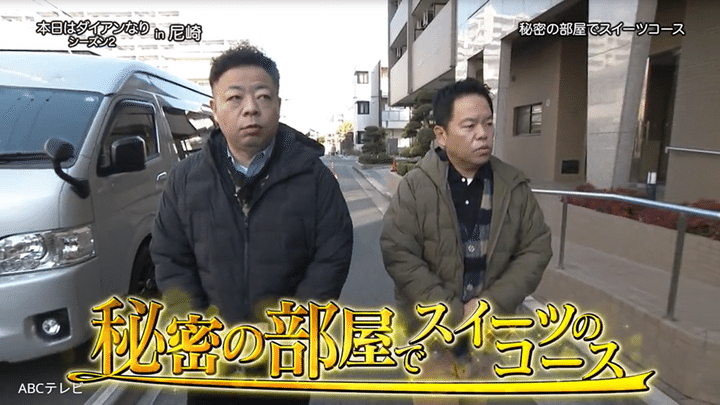 お笑いコンビ・ダイアンが、兵庫県尼崎市武庫之荘のスイーツショップへ。この店には隠し扉があり、開けると秘密の部屋につながっていた! ダイアンが潜入すると、そこには……!?