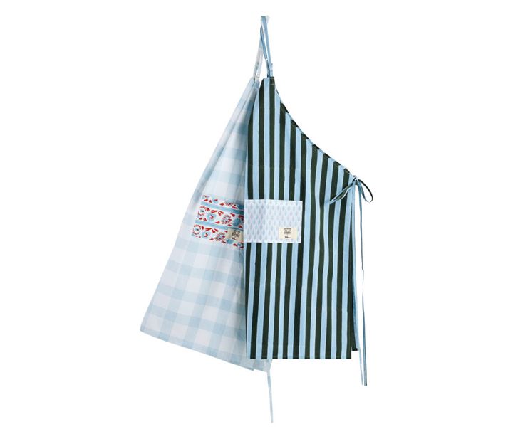 インドの伝統的な印刷技法を用いて仕上げられる〈エスゼット ブロックプリント〉のテキスタイルは、色彩が美しく、手仕事の温かさを感じられる。2025年春夏のファブリックで作られた〈ロンハーマン〉別注のエプロンは、アーカイブの残布を使ったポケットが実用性を兼ねたアクセントに。首紐はアジャスターで長さを調節でき、使い勝手もいい。