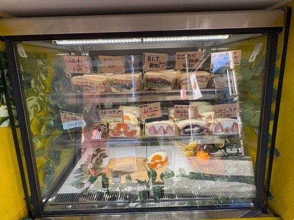 外からはガラス越しにおいしそうなサンドイッチとフルーツサンドが見えます。