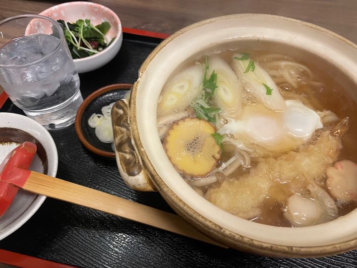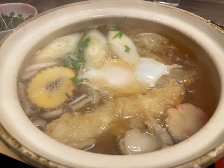 お店に着く前から、とにかく温かい系のうどんを食べたいと思っていたので(うどんは大抵温かいものではありますが)、迷わずなべ焼きうどんをいただきました。 海老天にホタテ、半熟卵と、具材もいろいろ入っています。