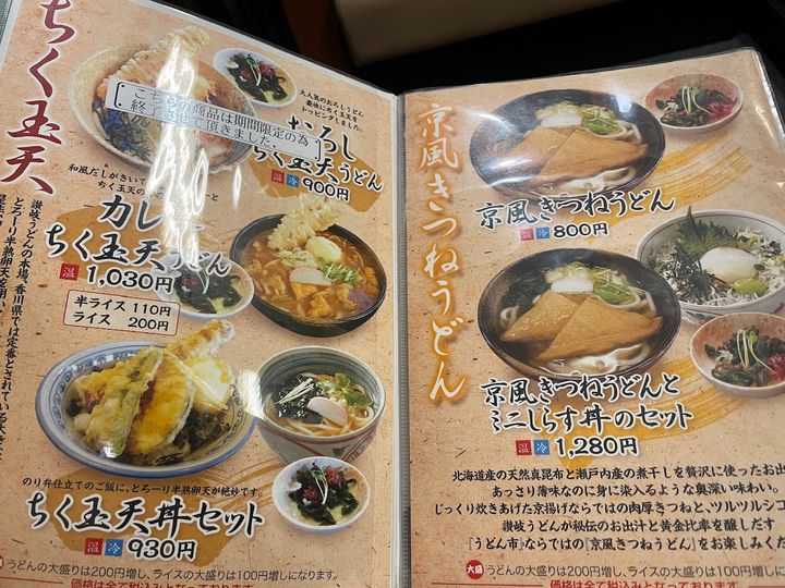 ざるうどん、きつねうどんなど一般的なメニューもありつつ、丼系もいくつかあるので、セットも魅力的です。