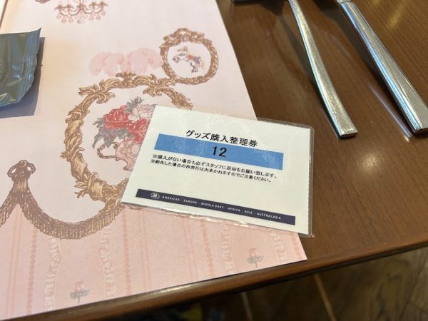 レストラン入り口でグッズ購入整理券を渡されます。アフタヌーンティーを楽しむ間に、順番で少人数ずつグッズが購入できるというシステム。グッズ購入も優雅な気持ちでできますね。