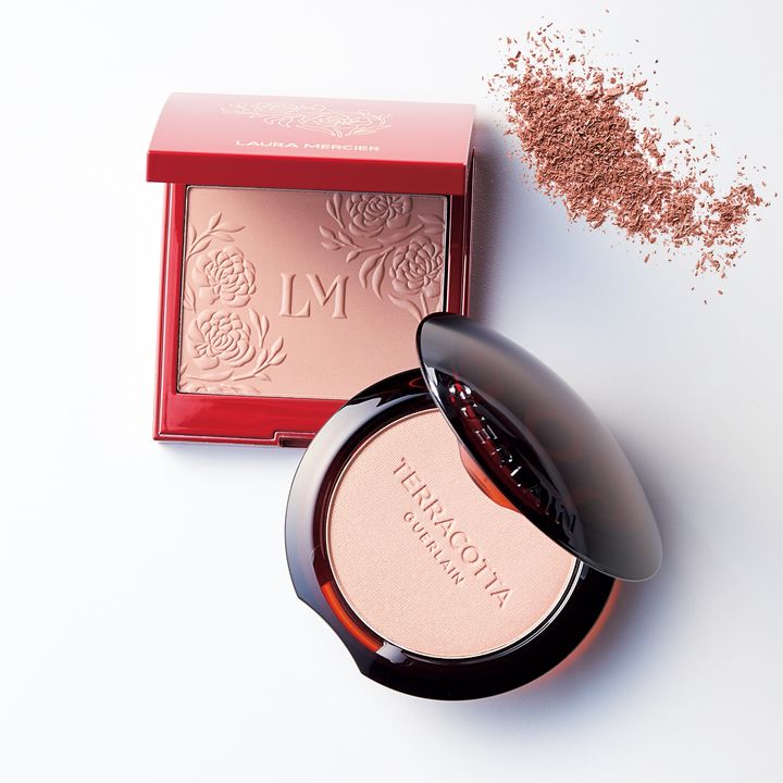 上:マットテクスチャーのジンジャーカラーでシャープに。ブラッシュ カラー インフュージョン ピオニー エディション 04 ¥4,730 ※数量限定(ローラ メルシエ ジャパン)下:ヘルシーな印象のパーリーベージュ。テラコッタ ブラッシュ 000 ¥7,590 ※3/1発売(ゲラン)