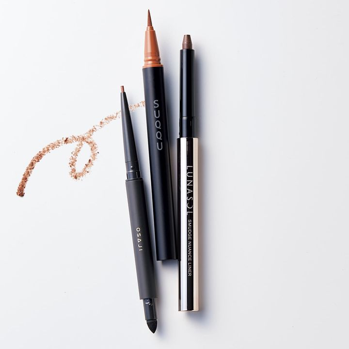 左から:多色ラメが入ったグレーブラウン。オサジ ニュアンス レゾナンス アイライナー EX02 ¥3,190 ※限定(OSAJI)目元の陰影を深め、血色をにじませるシナモンブラウン。SUQQU ニュアンス アイライナー 05 ¥3,300 ※1/24発売(SUQQU)カーキニュアンスのあるグレイッシュ。ルナソル スマッジニュアンスライナー EX04 ¥3,300 ※1/24限定発売(カネボウ化粧品)