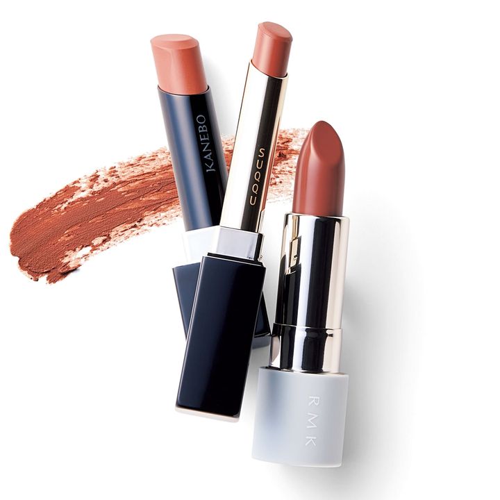 左から:赤みのあるベージュが溌剌とした印象。KANEBO ルージュスターブリーズ B107 ¥4,620(カネボウインターナショナルDiv.)クリーミーな質感。ミルキーで黄みのあるシナモン。SUQQU ベルベット フィット リップスティック 01 ¥5,830 ※1/24発売(SUQQU)クールトーンにもなじむローズウッド。RMK ザ マット リップカラー EX-07 ¥3,850 ※数量限定(RMK Division)