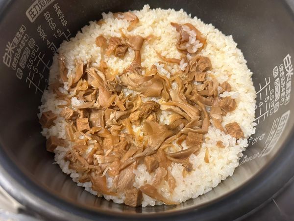 炊飯器を開けると、まいたけの芳醇な香りがふわっと広がり、思わず深呼吸したくなるほど。湯気とともに、キノコのお肉がゴロゴロ入った炊き込みごはんが姿を現します。