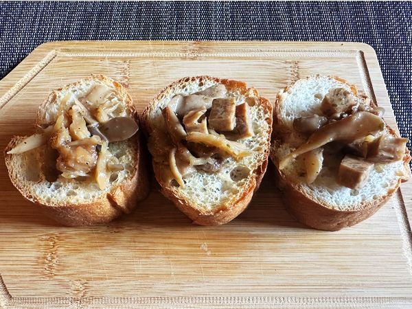 バゲットにのせて食べてみると…これはワインが欲しくなる味! オリーブオイルのまろやかさとガーリックのパンチが絶妙で、かむほどにキノコのお肉のジューシーなうま味が広がります。キノコとは思えないほど弾力があり、かみ応えも抜群。