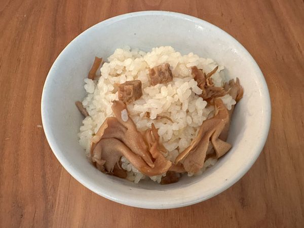 さっそくお茶碗によそって一口。口に入れた瞬間、まいたけの深いうま味と醤油ベースのやさしい味付けが広がります。キノコのお肉の弾力も心地よく、まるで鶏肉入りの炊き込みごはんを食べているような満足感があります。