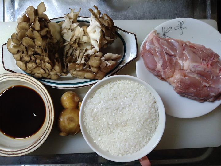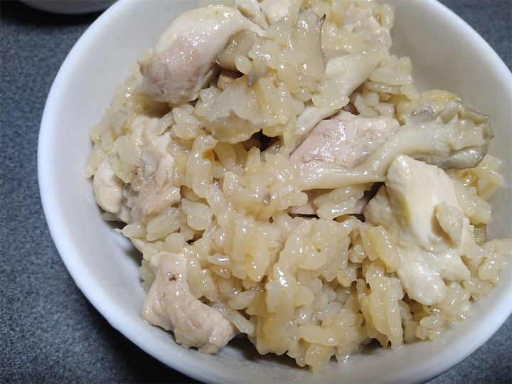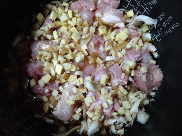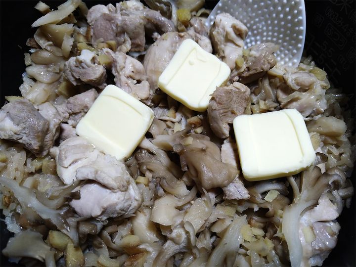 5.その上に鶏もも肉、舞茸、しょうがをのせて、普通炊きモードで炊く。炊けたらバターを入れて、混ぜ合わせたら完成。