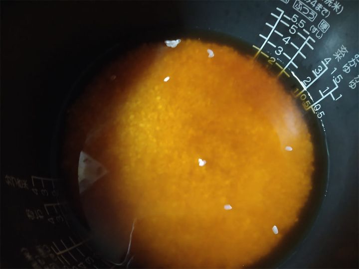 4.内釜に研いだ米、しょうゆ、鶏ガラスープの素を入れたら、2合目まで水(分量外)を入れる。