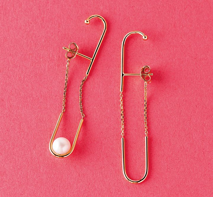 上のフックを耳にかけるようにつけるデザイン。〈右から〉ピアス〈YG〉¥73,700ピアス〈YG×パール〉¥81,400(ともにマリア ブラック/マリア ブラック 表参道店)