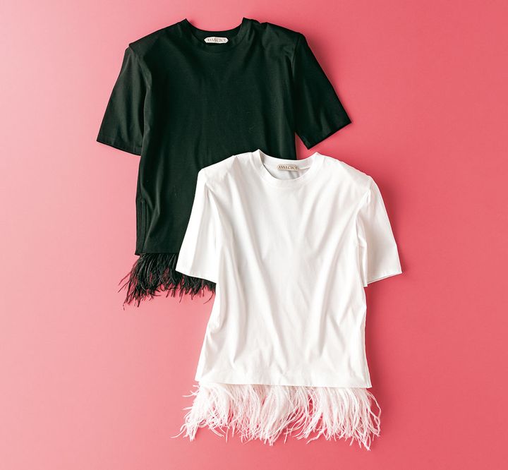 パワショルで、フェザーフリンジは取り外し可能。ホックで開閉できるサイドスリット付き。フェザートップス各¥53,900(ともにアンナ チョイ/エンメ)