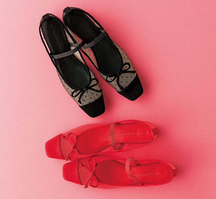 ストラップが底からついているので、足にぴったりフィット。フラットシューズ〈H1.8cm〉各¥26,400(ともにツル バイ マリコ オイカワ)