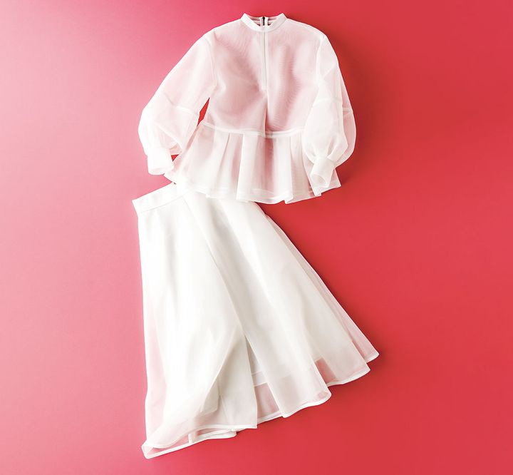 シアー素材のボンディング。さらりとしたソフトなタッチも魅力的です。シアーメッシュカットソー¥46,200スカート¥52,800(ともにADORE)