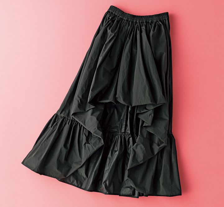 ハリのある素材の変形バルーンスカートは、前がミニ丈で後ろはロング丈。これ一つで最旬が叶います。スカート¥46,200(シー/エスストア)