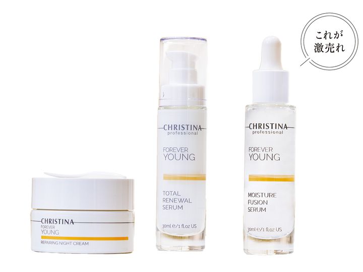 左から:ビタミンA・Eを配合し、肌のキメを整え若々しさをサポート。リペアリング ナイトクリーム 50ml ¥16,500、肌を細胞レベルで修復しバリアを強化。 トータルリニューアルセラム 30ml ¥13,200、ペプチドが凝縮されヒアルロン酸生成を促進。 モイスチャーフュージョンセラム 30ml ¥16,500(すべてクリスティーナジャパン)