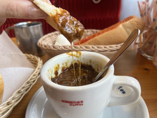 カップにカレーソースがたっぷりと注がれ、トーストは別皿で出てきました。自分でカレーに浸して食べるスタイルです。