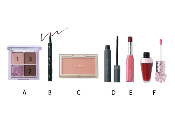 Cをほお骨から下にかけて三角形に入れる。リップはE→Fの順で重ね、Fのグロスは上唇の山だけオーバーにつける。