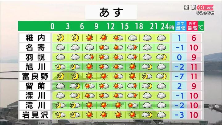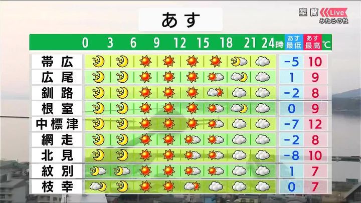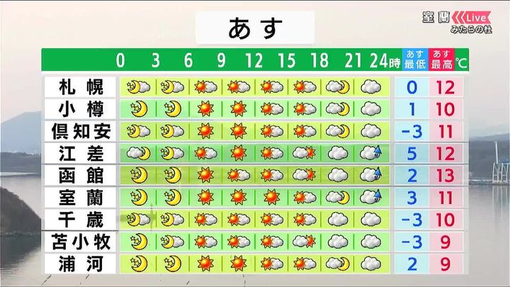 日中は各地で日差しが出るでしょう。夜は雲に覆われ、夜9時以降、道南や室蘭で雨が降り出します。