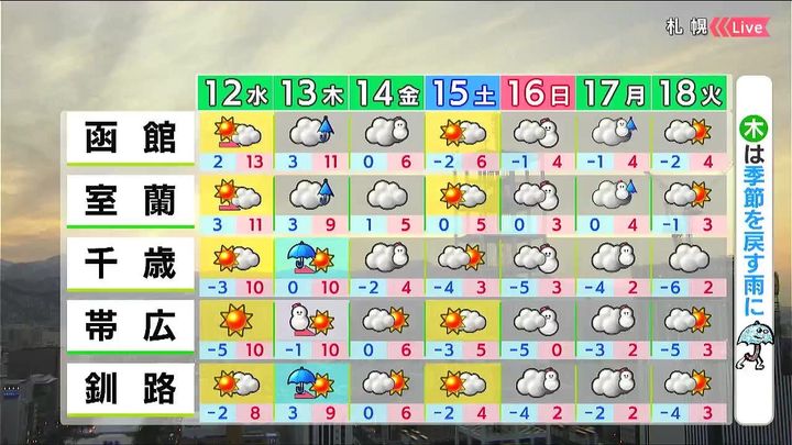 木曜の朝は雨が降り、十勝地方では木曜の朝は雪で軽く積もるでしょう。木曜の雨が季節を戻し、週末は最高気温が5度くらいと平年並みになりそうです。日曜と月曜は雪が積もるでしょう。