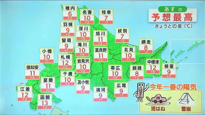 12日の予想最高気温は、旭川など10度以上のところが多くなります。札幌は12度で4月中旬並み、函館の13度は4月下旬並みでサクラが咲くころの暖かさです。泥はねやなだれなどにも注意して下さい。