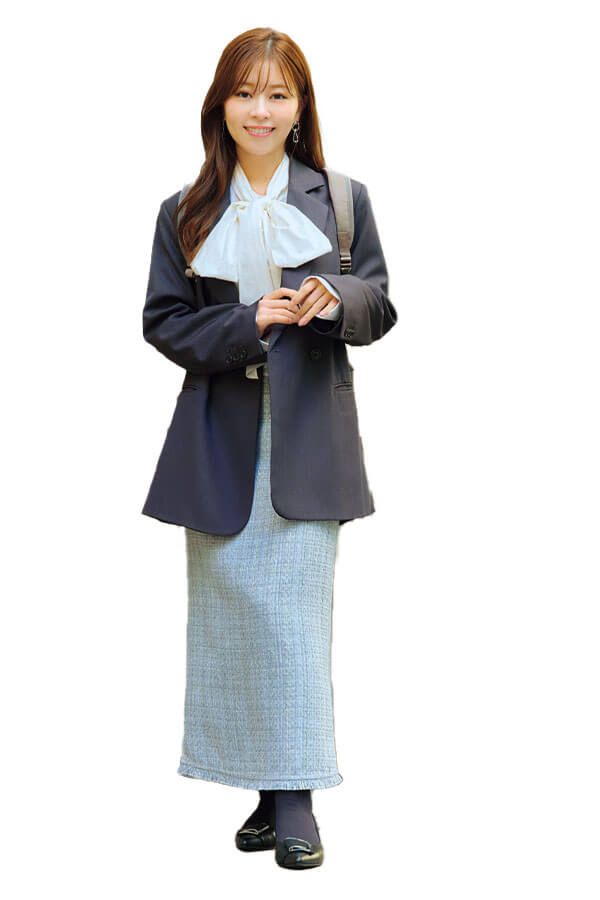 リュック[38×28×12]¥19,800/ダブルアンド(エース) ジャケット¥19,800/MERCURYDUO(MERCURYDUO ルミネエスト新宿店) ブラウス¥17,600/アルページュ ストーリー スカート¥13,970/Swingle(Swingle 有楽町マルイ店) ピアス¥3,850/ヘンカ(ロードス) タイツ¥1,980/17℃(17℃ by Blondoll 横浜ジョイナス店) 靴¥17,050/ダイアナ(ダイアナ 銀座本店)