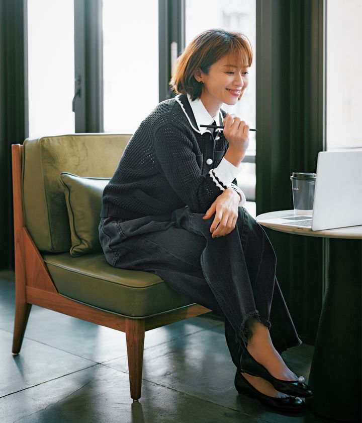 ニット×デニムの黒コーデにパキッとした白衿と袖部分のチラ見せで、清潔感を。オンラインミーティングでもフレッシュな印象をもたらしてくれそう。ブラックのタイ付きシャツならフェミニンなカーディガンも凛とした印象にブラッシュUP。