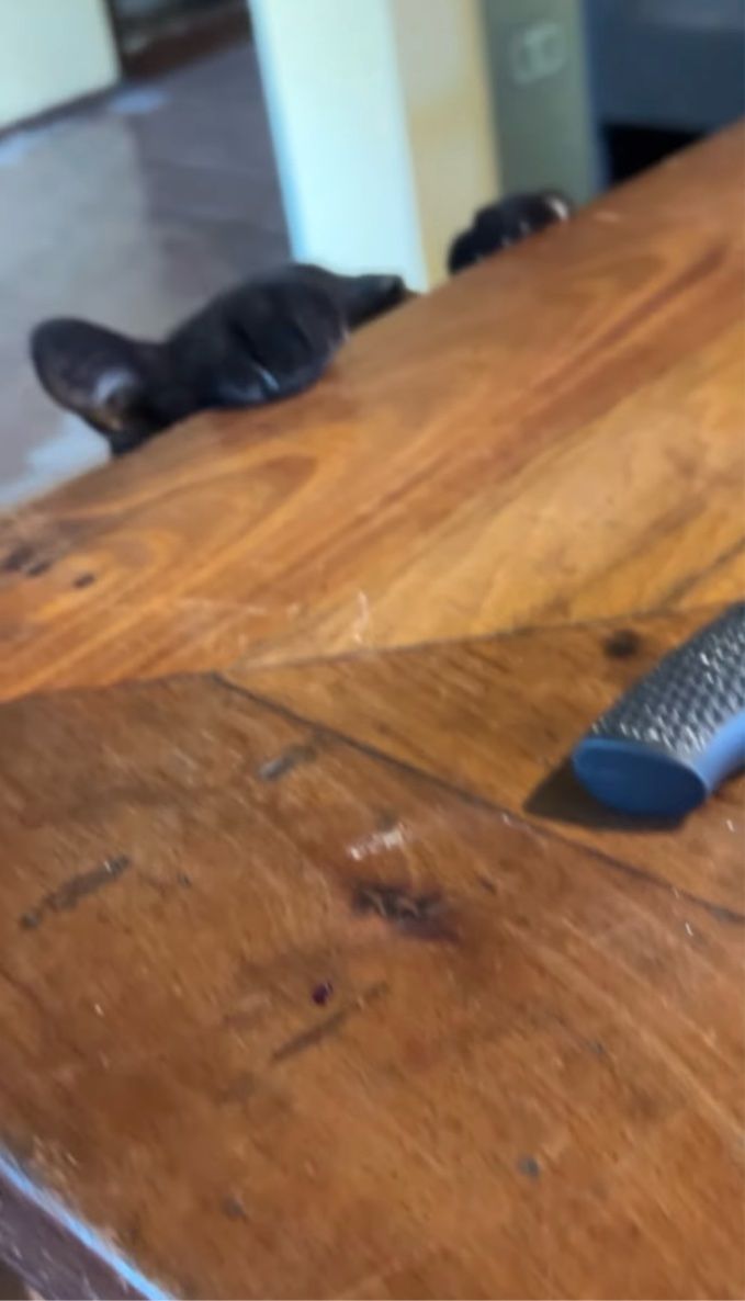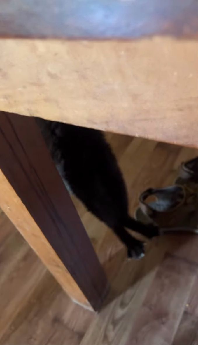 テーブルの端からひょっこり顔を覗かせているネコ。 必死な顔を浮かべて、一体何をしているのでしょうか??