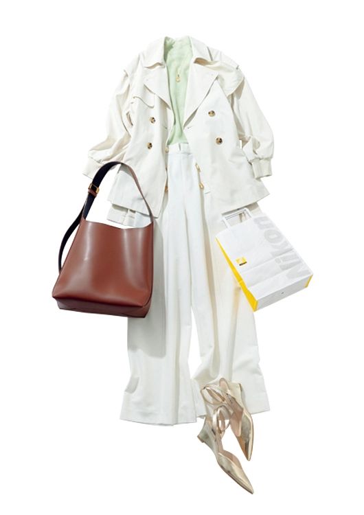 白を基調とした淡色コーデで全方位ウケ間違いなし。マニッシュになりがちなトレンチ×パンツも、これならふんわり女っぽく見えてやめられない!インには明るいグリーンを仕込んで、春らしくまとめました。