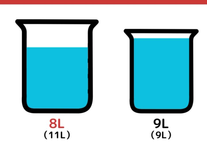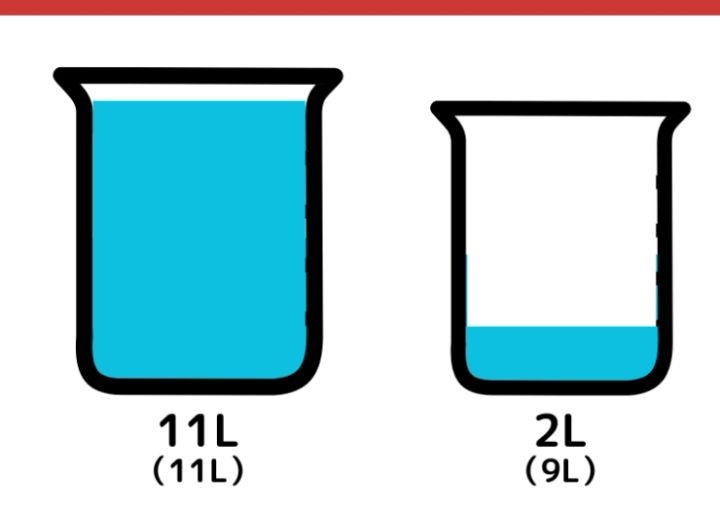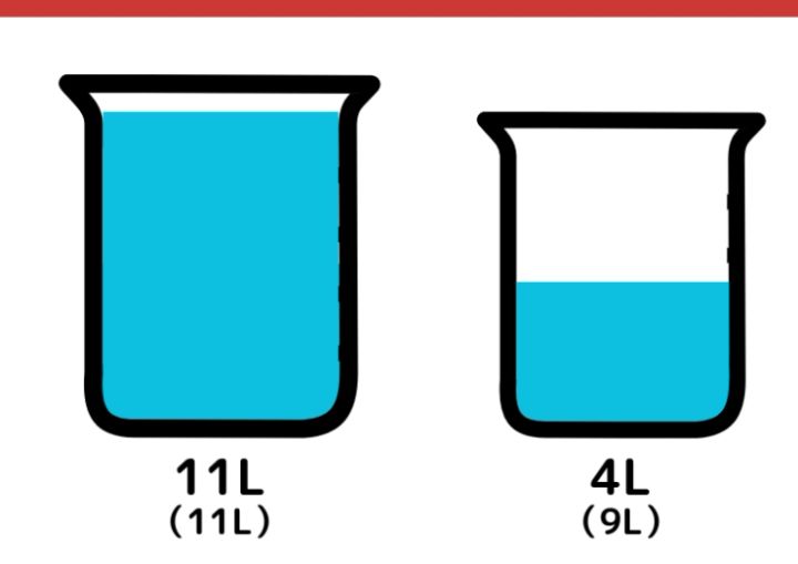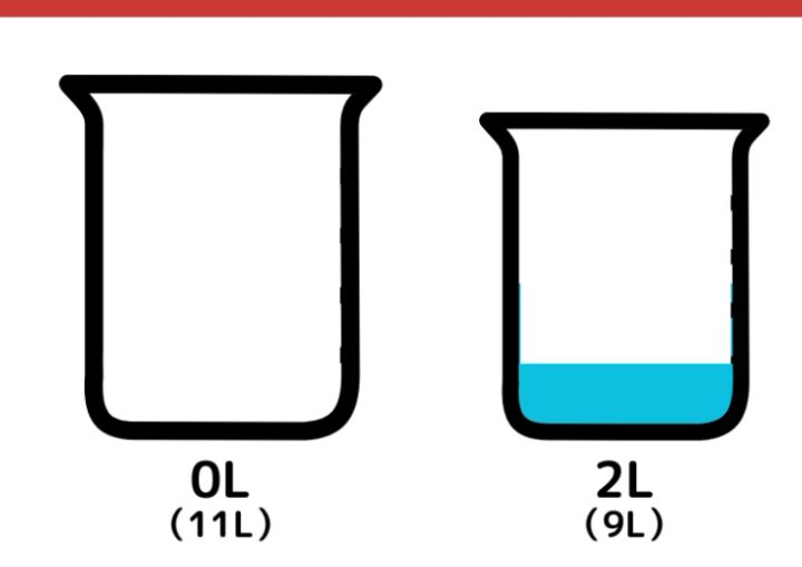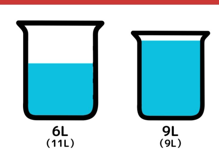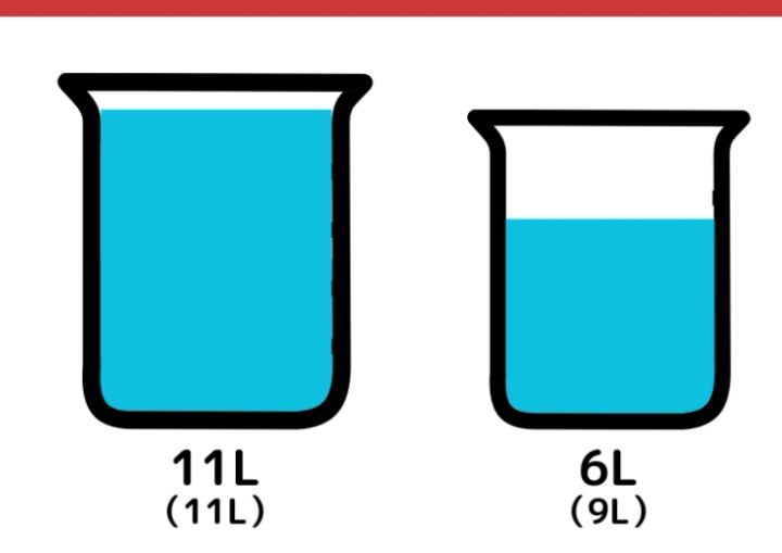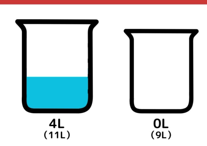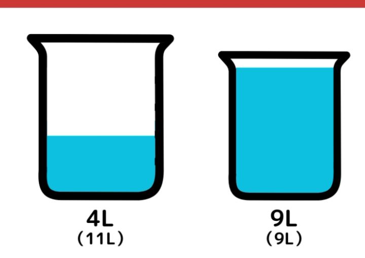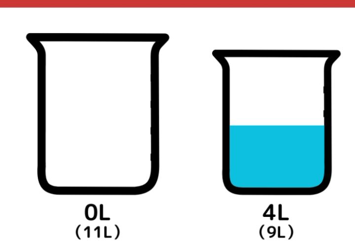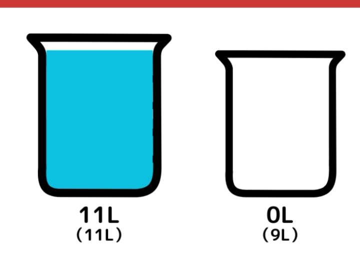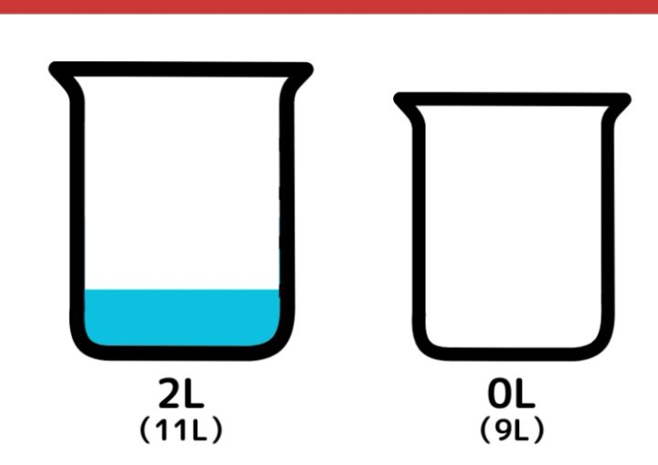 水がちょうど8L入る容器が手元にありません。11Lと9Lの容器を使って、ちょうど8Lの水を計る方法を考えてください。