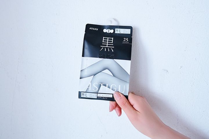 ATSUGIのシアータイツは25デニールの薄手の黒タイツ!程よく肌が透けるのがすっきりと美脚に見えるポイント。それ以上厚いタイツは脚が重く太く見えるので履きません。