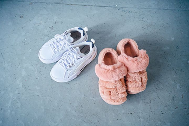 PUMAの厚底ボリュームスニーカーは真っ白にネイビーの締まる色効果で、脚をすっきり見せてくれます。デニムに合わせることが多いです。足元のボリュームが脚のラインをすっきりと細く見せてくれます。 クロックスのモコモコサンダル!素足で履くことが多いです。足元にボリュームを持たせることで足首が細く締まって見えます。